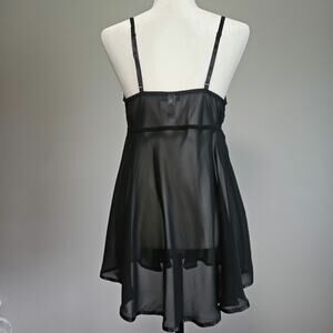 Flirty and feminine sheer black mesh babydoll with red floral lace cups, satin ribbon tie and adjustable straps. Excellent pre-owned condition, no noted flaws. Size Large.