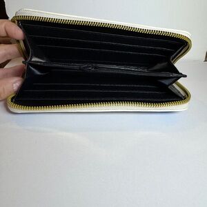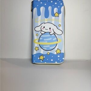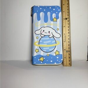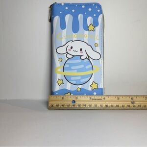 Cute Cinnamoroll design. Brand New wallet. Measures approximately 7 1/2 inches by 4 inches in width. Has three compartments, with slots for 12 card slots, a zippered coin, and an area for bills.