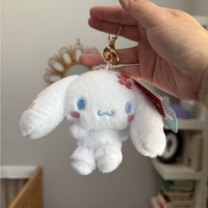 Cinnamoroll Sakura Keychain Plush features Sakura petals and flowers on Cinnamoroll’s ears and head. The cutest purse or key accessory!