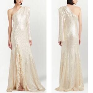 Cinq A Sept Angeline Sequin One Shoulder Ruffle Alabaster White Maxi Gown Sz 8
