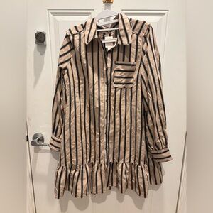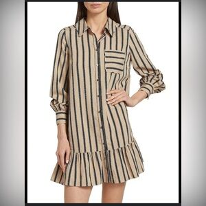 Cinq à Sept’s Arlette shirtdress is designed with contrast stripes. Cut to a mini length, this style features a loose silhouette with a ruffled hem for movement.