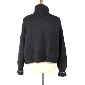 CINQ A SEPT EDNA CHARCOAL PINK TRIM RUFFLE FRONT CABLE KNIT TURTLENECK SWEATER