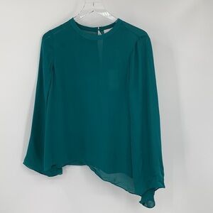 Long-sleeved silk chiffon blouse in a blue green with a diagonal asymmetric hem