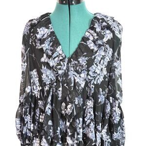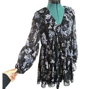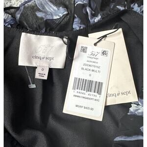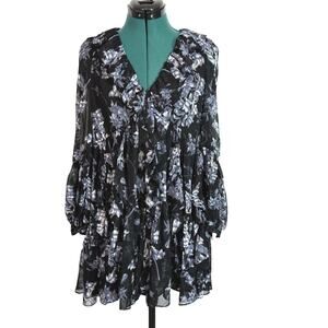 Cinq A Sept Jalen Long Sleeve Black Blue Multi Floral Mini Dress Ruffle Sz 0 NWT