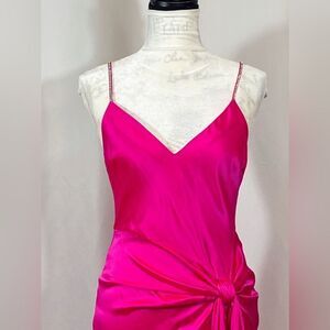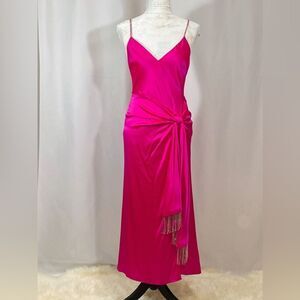 Cut from fine silk, Cinq à Sept's Kalena dress flaunts a V-neck and flattering leg slit. This body-skimming silhouette features a matching sash-tie with lustrous crystal fringes at the trim and shoulder straps.