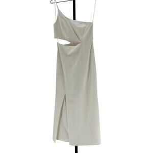 Cinq A Sept 'Laurile' Cream Polyester Dress Size 6: fully lined, hidden back zipper closure, one-shoulder styling, side cut-out, leg slit, measurements: 15 inch bust x 45.5 inch length.