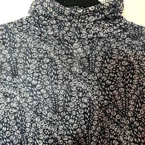 Stunning mesh turtleneck with shirred sides and sleeves. Great for layering! I believe the print is of blueberries. Small keyhole on back under button up turtleneck.