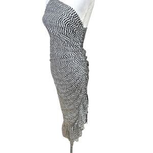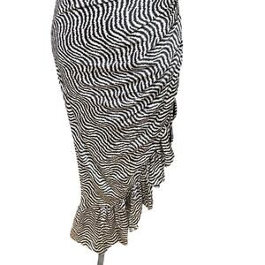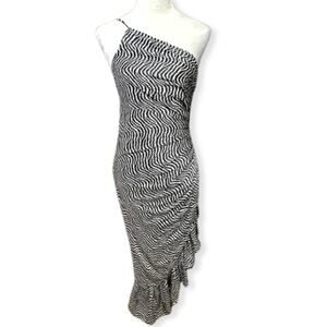 Cinq A Sept Midi Dress One Shoulder Silk Ruched Ruffle Hem Black/White W 2 NWOT