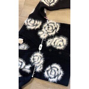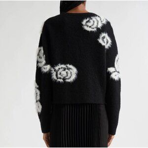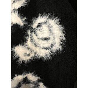 Sweeten sweater dress season in a wool-forward option festooned with fuzzy blooms and rendered in beloved black and white.