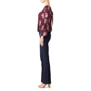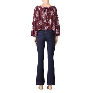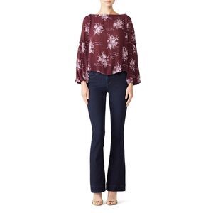 Sweet bouquets and statement sleeves further the romantic charm of this wear-anywhere Cinq à Sept top. Wear it on or off the shoulder. Wine floral printed crepe (100% Rayon). Boat neckline. Long sleeves. Tie at upper back.