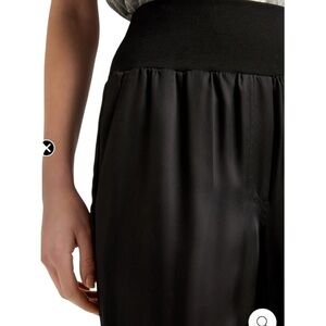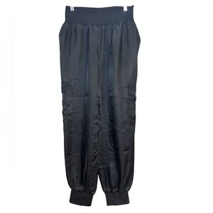 Elegant black satin joggers with cargo pockets. Features elastic waistband and cuffs. Ideal for versatile styling.