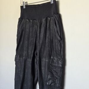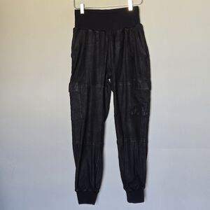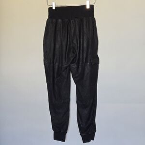 Sleek black track pants. Elastic waistband. Tapered cuffs. Stylish and comfortable.