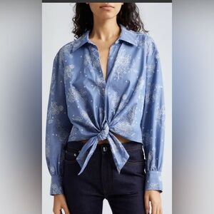 Cinq à Sept Blouse Abrielle Embroidered Blue Chambray Cotton Tie Hem Shirt XS