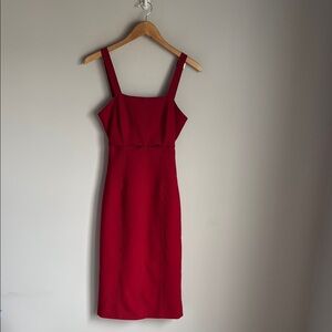 Red crepe (54% Polyester, 39% Viscose, 7% Elastane). Sheath. Sleeveless. Square neckline. Hidden back zipper closure. 46" from shoulder to hemline. Imported.