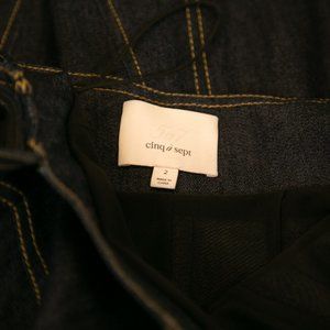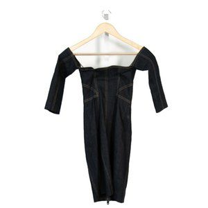 Cinq à Sept 'Fenton' mini dress in deep indigo denim. Featuring an off-the-shoulder neckline, a two-way exposed zip front, three-quarter sleeves, and contrast stitching. Gently used, good condition.