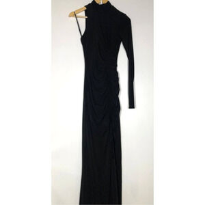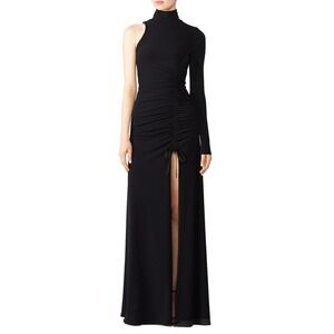 A one-shoulder silhouette and soaring slit balance out this figure-flattering ruched gown by Cinq à Sept.