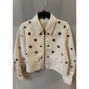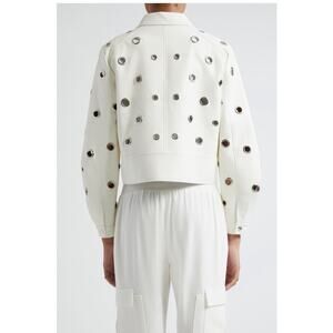 Polished grommet hardware puts a playful, contemporary spin on a faux-leather jacket that instantly elevates your look.