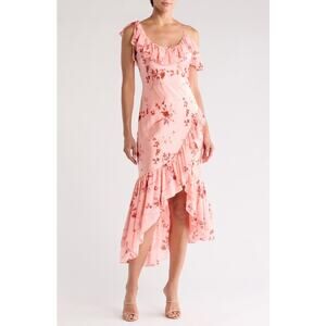 Ruffle trim accentuates the asymmetric silhouette of a stunning silk dress complete with a dreamy floral pattern.