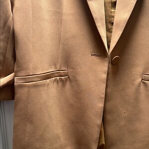 Elegant tan blazer with a classic design. Features a notched lapel and front pockets. Perfect for formal occasions.