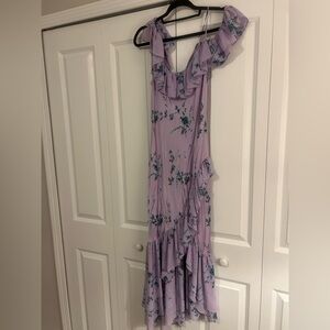 Chic light purple dress featuring green floral patterns. Ideal for stylish outings.