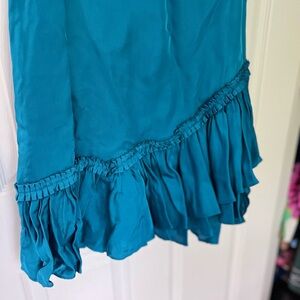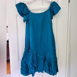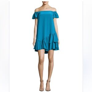 Cinq á Sept Minella Off-the-Shoulder Ruffled Satin Mini Dress in Teal