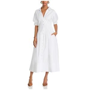 Puff sleeves and impeccable front pleats amplify the carefree sophistication of this light and airy midi dress.