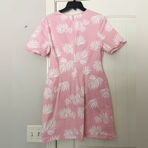 Pink floral printed cotton (98% Cotton, 2% Spandex). Hourglass. Short sleeves. Crew neckline. Hidden back zipper closure. Partially lined. 34" from shoulder to hemline.