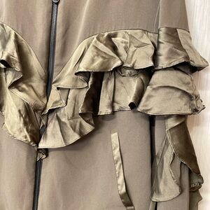 Major style moment right here! This Cinq à Sept bomber jacket is the ultimate statement piece — featuring dramatic tiered ruffles across the chest and sleeves that bring instant flair. The olive green base and black contrast trim make it effortlessly chic, while the silk combo gives it that luxe feel. Street style meets high fashion.