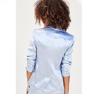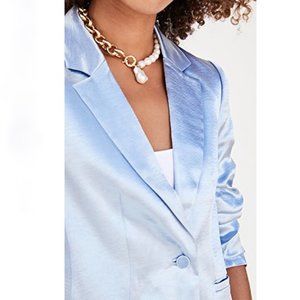 Chic sky blue blazer with a satin sheen. Features a single-button front. Ideal for stylish events.