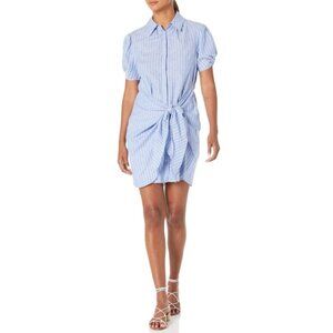 Cinq a Sept 'Tira' dress featuring a wrap tie-front, short puffed sleeves and an allover pinstripe print on a lightweight, linen-blend fabrication.