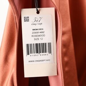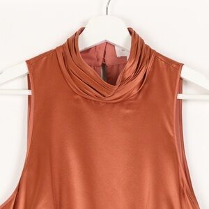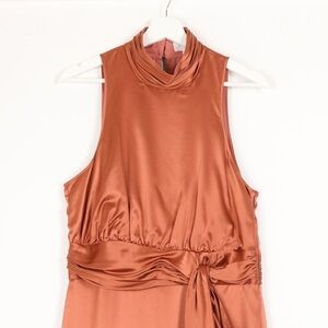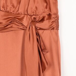 Elegant rust silk midi dress. Features a high neckline and ruffled hem. Perfect for cocktail weddings and evening events.