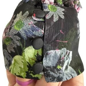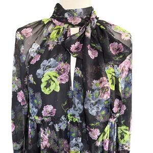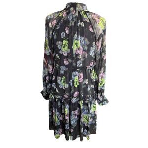 The Cinq à Sept Women's Midnight Bloom Revina Dress in size 6 is a whimsical and romantic goth fairy-inspired piece perfect for weddings, parties, or casual wear. This floral patterned dress features long sleeves, a round neckline, and a zip closure. Made of polyester with ruffle and button accents, the dress has a fit and flare style and is lined for added comfort. The pink color and bohemian theme make it a standout choice for the summer, fall, or spring seasons. This designer dress exudes a colorful and peasant charm with a touch of classic style.