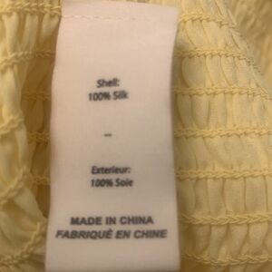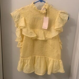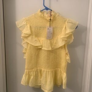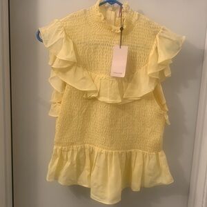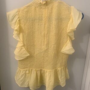 Elegant yellow top with ruffle details. High neckline. Sleeveless design. Perfect for a chic look. Designer top at a steep discount! Size L, but fits snug, so if you normally wear an M or are smaller up top, this is for you!