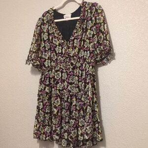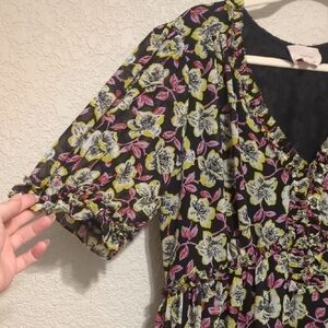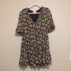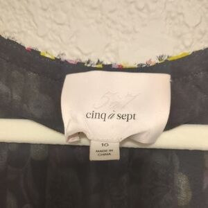 Cinq à Sept black multicolor floral v-neck Tish mini dress ruffle trim