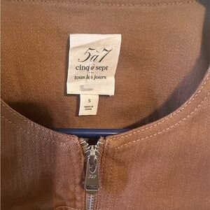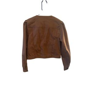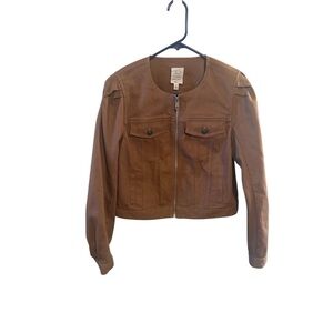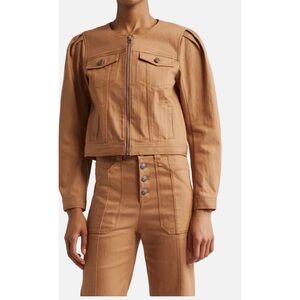 Cinq à Sept cropped brown utility jacket in a modern, tailored fit. Features zip front, chest flap pockets, and a chic structured silhouette. Perfect for layering with jeans, skirts,