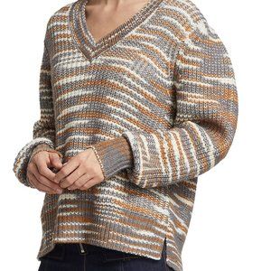 Cinq a Sept Amalie Sweater, NWT, L Cinnamon Multi Knit pullover sweater with asymmetrical striping and contrast rib trim. V-neck Long sleeves with banded cuffs Rib trim Pullover style 100% acrylic Dry clean Inspired by the radiant, magical hours between 5 and 7 PM—which is what the label's French name translates to—founder Jane Siskin designs sophisticated, feminine pieces for both workweek and the weekend. The designer's silhouettes also play with volume and eye-catching trimmings—perfect for cocktails or a special night out.
