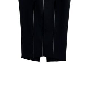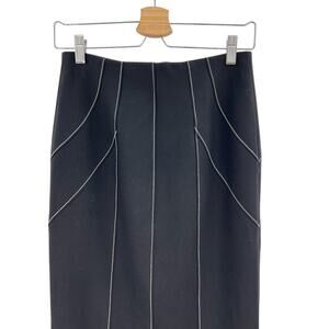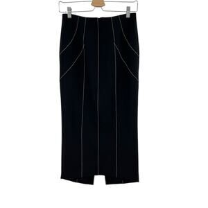 Midi length pencil skirt in black with contrast white seam stitch detail. Lined. Hidden zip at back. Back vent slit.