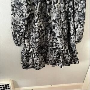 In good preowned condition. Long sleeve printed mini dress with tiered skirt and smocked high neckline. Hidden zipper on back.