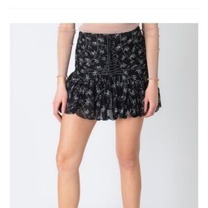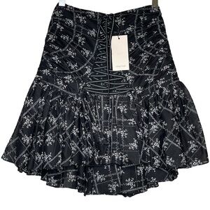 Cinq a Sept black and white ‘Amelia’ floral print mini skirt fully lined featuring tonal stitching and hardware, corset style lace-up at front, gathered detailing throughout and concealed zip closure at side.