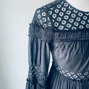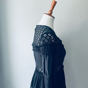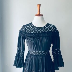 Chic black lace dress with long sleeves. Features intricate cut-out details. Perfect for elegant occasions. In excellent condition, size 4.