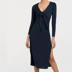 The Cinq à Sept Brenna Knot-Tie Gathered Crepe Midi Dress in Peacock Blue is a stunning blend of structure and softness. Crafted from a stretch crepe blend (95% polyester, 5% spandex), it features a self-tie bust detail, ruched bodice, and a side slit that adds just the right amount of movement and allure.