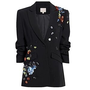 This tailored one-button blazer is elevated with lustrous sequined blooms and scrunched sleeves.