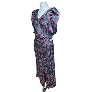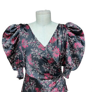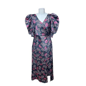 Charming midi-length dress features a soft floral print, framed by romantic puff-sleeves and a faux wrap silhouette.