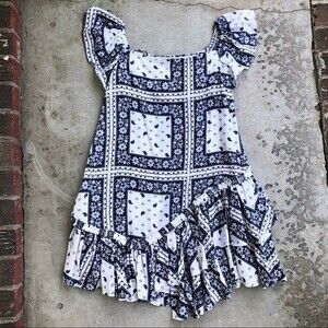 Cinq a Sept Shift Dress Minella Off the Shoulder Mini Asymmetrical Ruffle Hem Blue White.