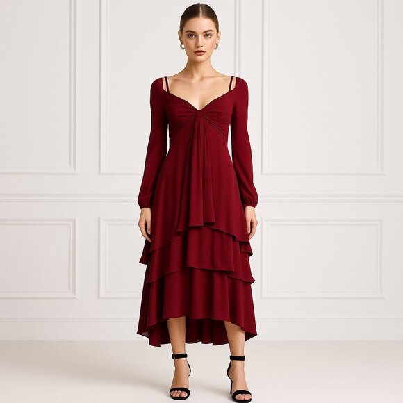 Turn heads with the Cinq à Sept Fira Tiered Silk Dress in striking pomegranate red. This elegant dress features a flowing silhouette with luxurious tiers of silk, creating a graceful and feminine look. The statement bishop sleeves add a romantic touch, while the rich red hue exudes confidence and sophistication. Perfect for special occasions or an evening out, this dress effortlessly combines modern flair with timeless elegance. The lightweight, flowy fabric drapes beautifully, making this Cinq à Sept dress a standout piece in any wardrobe. Embrace bold, chic style with this stunning tiered silk design.