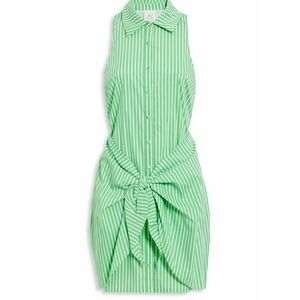 This vibrant green mini dress by Cinq a Sept features a stylish ruched design with a chic tie front detail. Perfect for a night out or cocktail event, the sleeveless dress boasts a polo collar for a sophisticated touch. Its sheath silhouette offers a modern and elegant look, making it a standout piece for any casual or evening occasion.