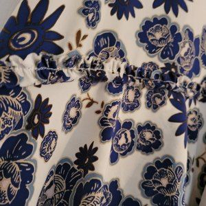 Beautiful Cinq A Sept 100% silk hydra top short sleeve blouse in a blue & white floral print, size Medium.
