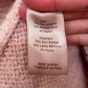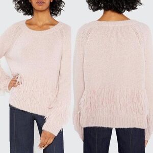 Cinq a Sept Izabella Alpaca Wool Fringe Sweater in Light Pink. Women's Size Small. Made in Peru. Alpaca and Merino wool blend, crew neck, long-sleeve, pull-over style, fringe accent detail at sleeve and waist, relaxed fit. Cinq á Sept typically fits true to size. Excellent pre-owned condition, like new, no major flaws to note.