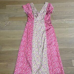 100% poly. Dry clean only. Fully lined. Satin fabric. Front button and waist tie closure. Ruched detail
