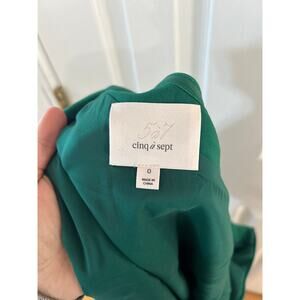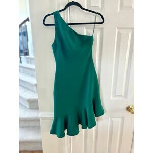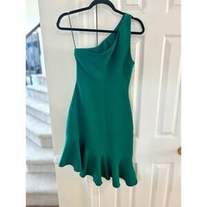 Excellent condition. Kelly green, one shoulder, ruffle hem. Sheath dress. Size zipper.